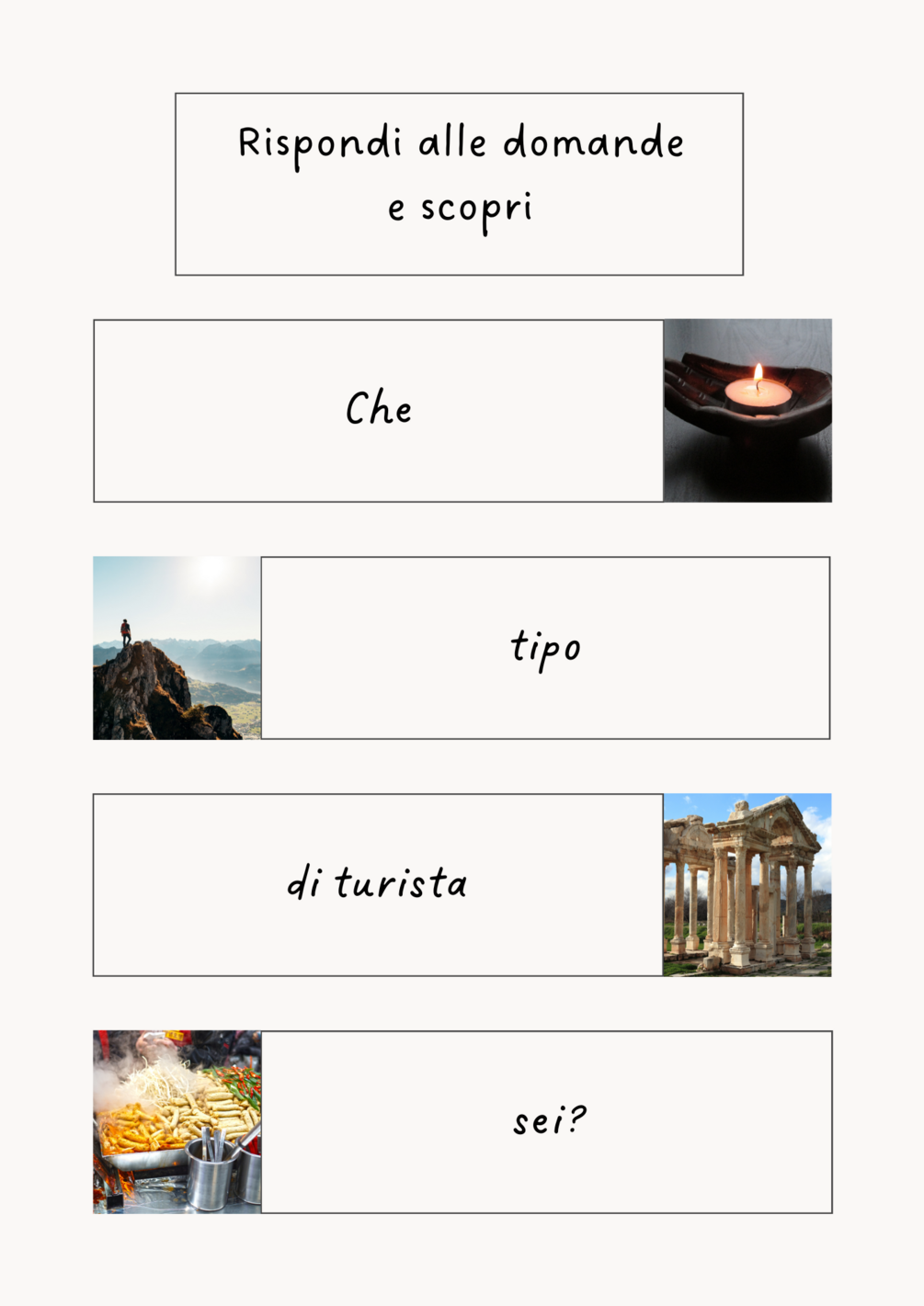 Che tipo di turista sei? È il classico test da compilare sotto l’ombrellone, o magari adesso fra i banchi di scuola, con un pizzico di nostalgia: le domande profilano diversi tipi di viaggiatore e turista a seconda delle scelte che ognuno farebbe in determinate situazioni. È un’attività divertente e utile per avviare la conversazione o per attivare il lessico. In calce al test, oltre ai 4 profili con le “soluzioni” al test, trovate qualche domanda per avviare una discussione. Può essere utilizzata come attività da svolgere a casa dopo aver svolto l’attività Turista VS Viaggiatore, ad esempio.